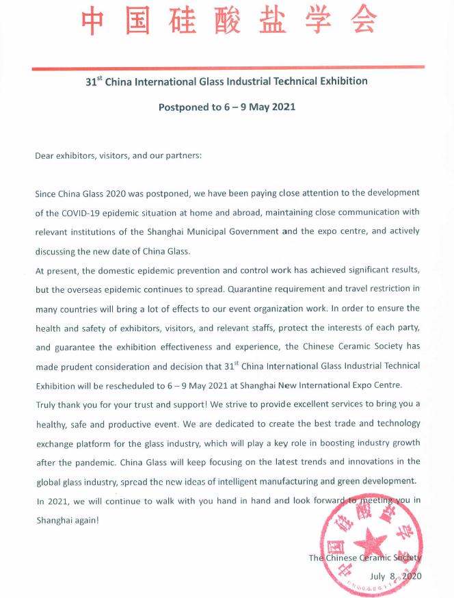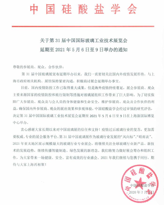 关于第31届中国国际玻璃工业技术展览会延期至2021年5月6日至9日举办的通知.pdf