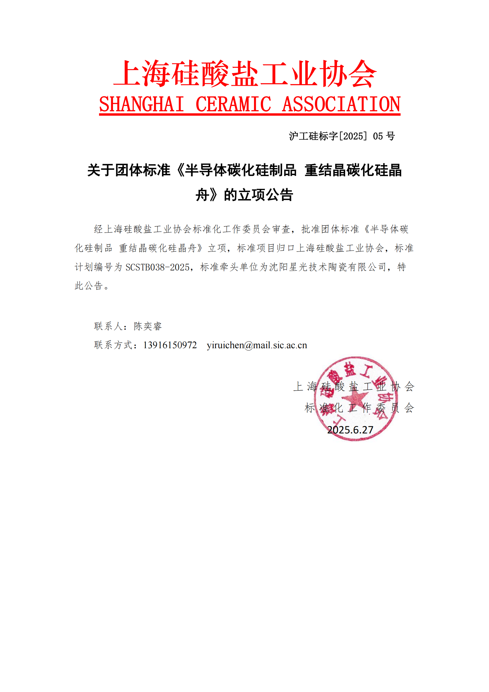 关于团体标准《半导体碳化硅制品 重结晶碳化硅晶 舟》的立项公告