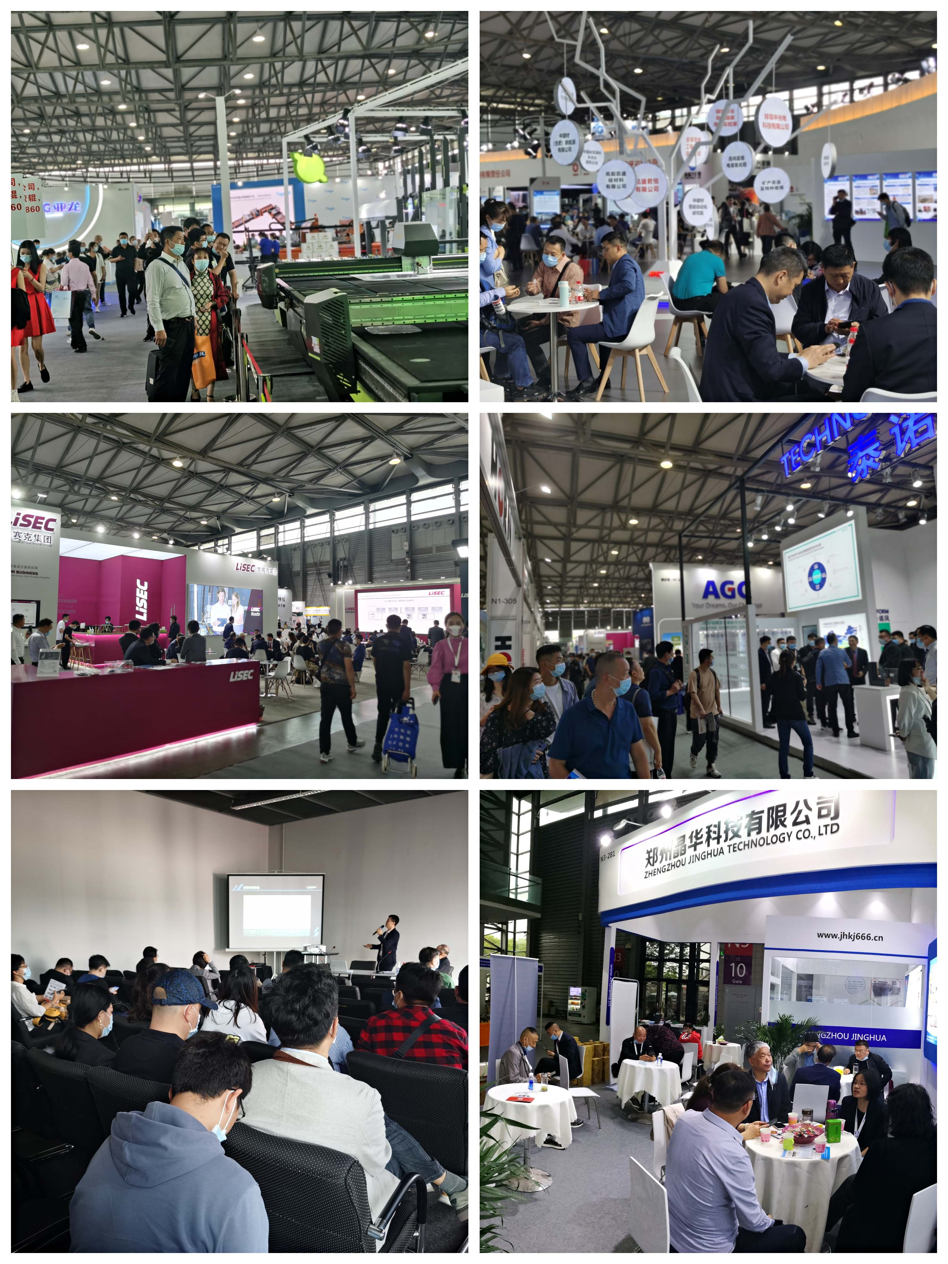展会占地近9万平米共7个展厅:N1馆为国际展区,集结了德国、意大利国家展团和众多全球玻璃行业主流品牌,N2馆为原片生产厂商和大型综合类玻璃设备厂商,N3馆至N5馆、W5馆为玻璃生产和深加工设备厂商,W4馆为中小企业展示区,涵盖了日用玻璃、装饰玻璃、磨具磨料、辅料、五金、配件等领域。本届展会展品凸显了节能降碳、数字化、智能制造等特点。应用于光伏产业、智能终端领域的超白超薄玻璃和柔性玻璃成为本届展会一大技术亮点,凯盛科技展示了30微米柔性可折叠玻璃、0.12mm超薄电子触控玻璃以及新冠疫苗用高品质5.0中硼硅药用玻璃。我会会员单位中国建材有限公司带来了智能手机屏下指纹识别用关键材料,南玻集团展示了新一代高端浮法触控显示用锂铝硅酸盐玻璃盖板,洛阳兰迪玻璃机器股份有限公司、上海耀皮玻璃集团股份有限公司、上海鑫诺玻璃技术有限公司、上海吉驰玻璃科技有限公司、郑州德众刚玉材料有限公司、郑州晶华科技有限公司分别带来了代表公司实力新一代真空玻璃、门窗玻璃、防火玻璃、电致变调光玻璃、特种玻璃、耐火材料。