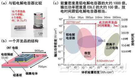 这些高性能源于(1)元件结构采用的全新设计的EDLC“微型EDLC”,(2)基于光刻技术的微细、高精度、高密度加工技术,(3)高纯度碳纳米管(CNT)的高导电性和较大的比表面积等。