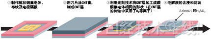 IEDC制造工艺的概要:(1)将U形金集电体组合成梳状,然后利用对电解质稀硫酸有很强防水性的环氧树脂(SU8)制作电极隔板。(2)用刀片在其上涂抹CNT膏,(3)利用光刻和蚀刻技术形成CNT层。此次采用了稀硫酸作为电解质。(图为日经技术在线根据产综研的资料绘制)