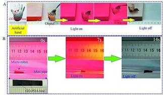 A图:一只石墨烯纸制作的人工手在光源明灭中抓取了小物件。