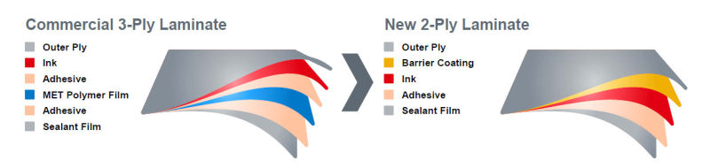 欧力斯进一步解释道,传统的食品包装袋一般有三层层压粘合在一起,最里层的作用是食物保鲜,中间层起到隔热防晒作用,最外层是用来彩印或者贴标签。所谓“纳米防护涂层”实际上是代替了中间层隔热防晒的功能。