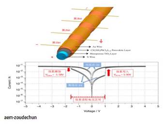 钙钛矿太阳能电池之所以具有可观的光电转换性能,材料本身优良的载流子传输能力是一个决定性因素,而这种性质极有可能赋予钙钛矿材料在其他更多领域“一展身手”的机会。 忆阻是指一类具有记忆响应的电阻,其具有的高、低阻两个电阻状态恰好对应了二进制中“0”和“1”两个状态,因此,忆阻器在信息存储及计算领域具有良好的应用潜力。相较于传统的存储材料,忆阻具有非易失性、低能耗、高开关比、快响应速度以及超越摩尔定律限制的能力等性质。在传统硅基半导体发展越来越接近极限的时代背景下,有关忆阻器的研究激发了广泛的研究兴趣。