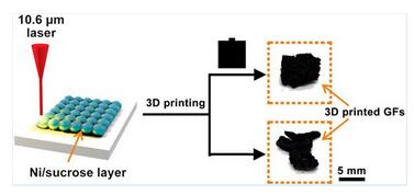 研究人员使用二氧化碳激光器来生产石墨烯块,这是激光烧结3D打印机所使用的一种。当激光照射到糖和镍粉末上时,糖被熔化,镍作为催化剂。随着混合物冷却,形成具有大孔隙的低密度石墨烯(这些毛孔占材料体积的99%)。