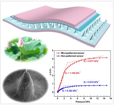 南方科技大学材料科学与工程系郭传飞教授课题组采用了仿生模板法,制备出低成本的电容型柔性触觉传感器。以荷叶为模板,复写出具有荷叶微塔结构的聚二甲基硅氧烷(PDMS)作为柔性衬底;下电极由具有荷叶微塔结构的PDMS薄膜喷涂超细银纳米线制成,具有较好的顺形性和导电性;采用喷涂银纳米线的透明聚酰亚胺膜作为上电极,聚酰亚胺本身作为介电层,构成电容型传感器。该器件具有较高的灵敏度(1.2 kPa?1)、较快的响应速度(36 ms,与人体皮肤响应速度相当)以及较好的稳定性(可重复循环检测10万次以上而不产生疲劳)。有限元模拟分析表明,这种仿荷叶的高深宽比、低密度微结构对器件性能有重要的增益作用。(来源:MaterialsViews)