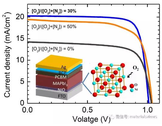 2012年,韩国成均馆大学Nam-Gyu Park课题组首次报道了全固态钙钛矿太阳能电池,并取得了9%的光电转换效率和长达500小时的空气稳定性。由于钙钛矿材料具有较高的光吸收系数,在短短的6年中,钙钛矿太阳能电池效率取得了突飞猛进的增长。截至目前,已获得了23.7%的认证效率。在倒置p-i-n钙钛矿电池中,通常采用宽带隙和热稳定性良好的NiO作为空穴传输层。由于NiO具有较差的导电性和较低的迁移率,人们通常采用离子掺杂的方法来改善NiO的电学性能。除此之外,调节退火过程中的氧含量是另一种改善NiO电学性能的简便方法。氧含量的改变可以使NiO中的镍/氧比发生变化,一个Ni2+空位可以产生两个Ni3+离子,而Ni3+离子的形成则决定了NiO的p型特性。因此,研究NiO退火过程中的氧含量对于提高倒置钙钛矿太阳能电池效率具有重要的意义。