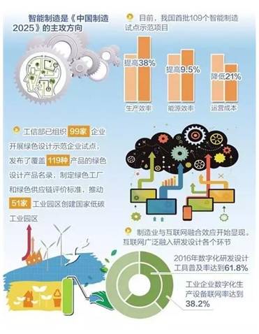 《中国制造2025》提出的五大工程已率先启动。目前,国家动力电池创新中心已挂牌成立,增材制造、工业机器人中心进入创建阶段;开展了226个智能制造综合标准化试验验证和新模式应用项目,遴选了109个智能制造试点示范项目;安排工业强基工程47个方向61个项目;推进了绿色制造标准体系建设、绿色产品评价、绿色工厂试点等工作;实施了增强制造业核心竞争力三年行动计划、新兴产业重大工程包,以及轨道交通装备、新能源汽车等关键技术产业化项目。