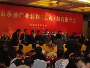 2011年1月6日下午,在上海虹桥迎宾馆召开了合肥市承接产业转移(上海)招商会推介会。来自上海市中外企业界CEO代表,以及有关行业协会代表约300人参加了会议。我会应邀也派人参加了会议。 会议开始前播放了合肥市貌的宣传片。合肥市委常委、副市长魏晓明先生主持了会议,安徽省委常委、合肥市委书记孙金龙先生首先致辞,并就合肥的投资环境、投资导向、投资政策、投资重点区域、合肥市主要对外服务机构等内容作了简要介绍。接着,上海市人民政府合作交流办公室周贤行副主任致辞。会上,合肥市与上海14家中外企业举行了签约仪式。  近年来,合肥市的经济贸易有了快速增长,为了加强长三角区域的经济联动,加快新技术和部分产业的转移,合肥市委、市政府此次专程来沪举行产业转移招商推介会。(协会搞)