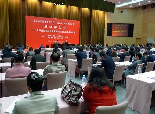 上海巿经济团体联合会、上海巿工业经济联合会,于2012年4月13日上午,在上海市经济管理干部学院召开形势报告会。会议特邀全国政协常委、国家能源委员会专家咨询委员会主任、清华大学教授、低碳能源实验室主任,原国家发改委副主任和国家能源局局长张国宝同志作“世界能源格局的变化和中国面临的挑战和机遇”专题报告。巿经团联蒋以任会长主持了报告会。来自本市行业协会和部分企业代表应邀参加了会议,我会也派人员去听报告。