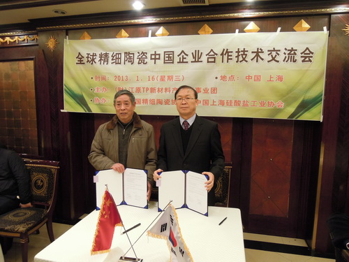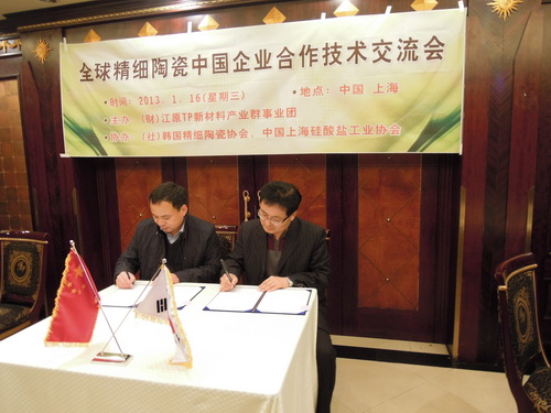 会议最后,来访的韩国企业代表,还与我会德宝密封件有限公司、陶宝陶瓷新材料有限公司、创新特种陶瓷有限公司、宜刚精密陶瓷有限公司签订了“共同推进精细陶瓷产品发展”的交流合作意向书。完毕,双方企业界的代表作了简要发言。(协会稿)